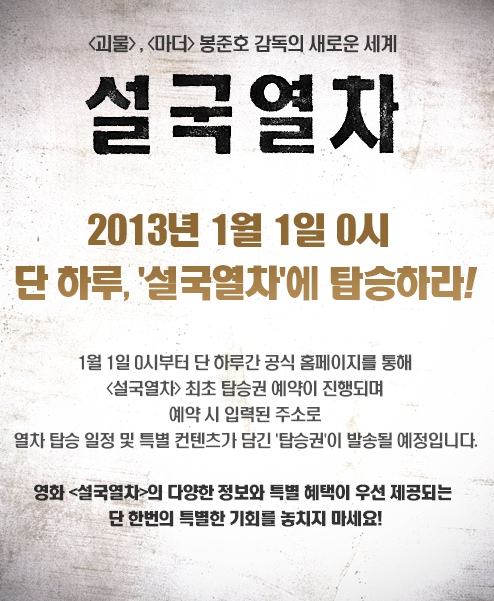 '설국열차'는 '괴물'을 연출한 봉준호 감독의 글로벌 프로젝트로 크리스 에반스, 송강호, 틸다 스윈튼 등 세계적인 배우들이 함께했다. 2013년 국내 개봉예정인 '설국열차'는 국내 첫 이벤트로 오는 1월 1일 자정에 탑승객을 모집하는 행사를 마련했다.
