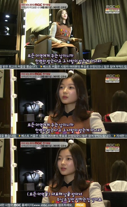 이날 김유정은 "아역 배우상을 누가 탈 것 같은지"는 제작진의 질문에 "누구를 꼭 뽑아 상을 준다는 건 좀 그렇다"며 입을 열었다.
