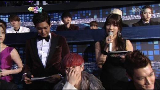 29일 오후 8시45분부터 서울 고려대학교 화정체육관에서 생방송으로 진행된 2012 SBS 가요대전에서 MC를 맡은 아이유는 티아라 무대가 끝난 이후 출연진 중 빅뱅 멤버 태양과 인터뷰를 하던 도중 뒤에 앉아있던 은혁의 모습과 동시에 포착돼 눈길을 끌었다.