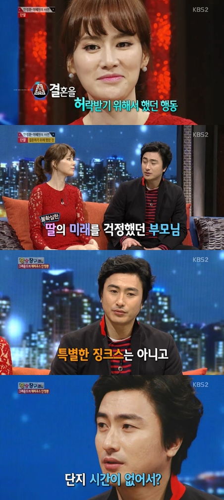 15일 오후 방송된 KBS 2TV '김승우의 승승장구'에서는 결혼 13년차 안정환·이혜원 부부가 출연해 결혼 비하인드 스토리를 공개했다.
