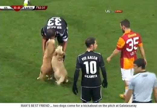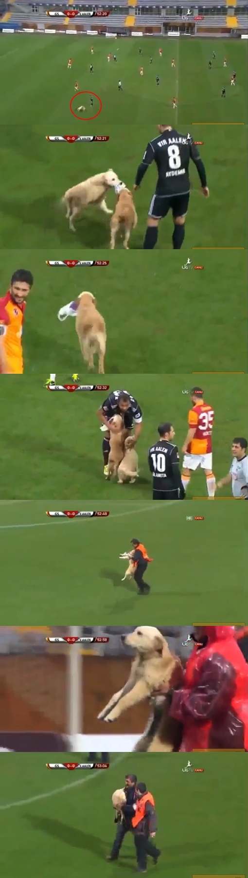 지난 13일 이스탄불에서 열린 갈라타사라이(터키)와 VFR 알렌(독일 2부리그)과의 친선 경기 도중 래브라도 리트리버 개 두 마리가 경기장에 난입했다.