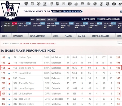 잉글랜드 프리미어리그가 24라운드 종료 후 공식 홈페이지를 통해 '2012~13 시즌 EPL 선수 랭킹'을 발표했다.