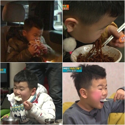 해당 사진은 MBC 예능프로그램 '일밤'의 '아빠 어디가'에서 주목받고 있는 윤후 군이 방송에서 음식을 맛있게 먹는 모습을 포착한 사진들로, 윤후 군은 햄버거, 자장라면, 라면 등을 맛있게 먹는 모습을 선보이고 있다.