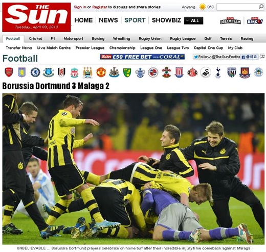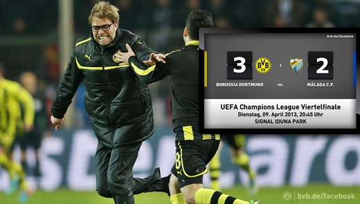 도르트문트가 10일(이하 한국시간) 독일 도르트문트 베스트팔렌스타디온에서 열린 '2012~13 시즌 유럽축구연맹(UEFA) 챔피언스리그' 8강 2차전에서 말라가에 3-2 역전승을 거두며 1,2차전 합계 1승1무를 기록, 4강 진출에 성공했다.