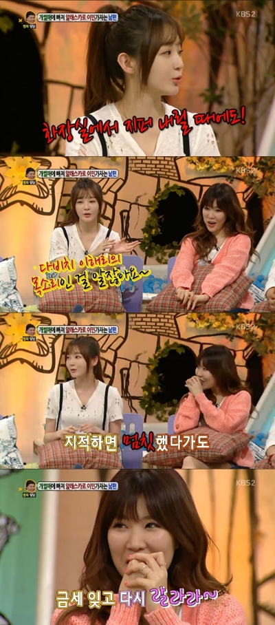 22일 오후 방송된 KBS 2TV '대국민 토크쇼 안녕하세요'에 출연한 강민경은 이해리가 화장실에서도 노래를 부른다고 폭로했다.