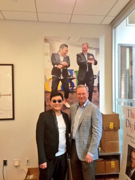 사진에는 싸이와 에릭 슈미트의 다정한 모습이 담겼다. 두 사람의 뒤에는 싸이의 히트곡 '강남스타일'의 '말춤'을 췄던 과거 사진이 벽에 전시돼 눈길을 모은다.