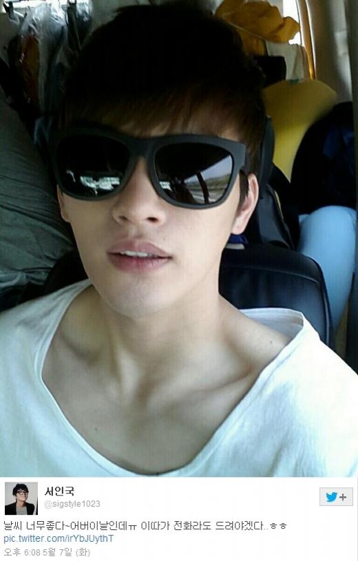 8일 서인국은 "날씨 너무 좋다~어버이날인데ㅠ 이따가 전화라도 드려야겠다..ㅎㅎ"라는 글과 함께 사진을 한 장 게재했다.