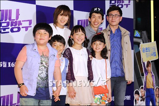 배우 최강희, 봉태규, 정익환 감독과 아역 배우들이 8일 오후 서울 광진구 자양동 롯데시네마 건대입구에서 열린 영화 '미나문방구' VIP 시사회에 참석해 포토타임을 갖고 있다.