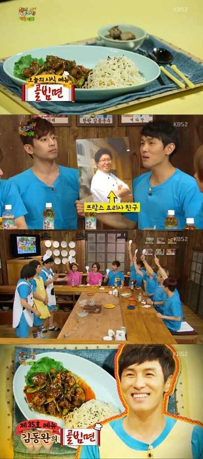 김동완은 16일 오후 방송된 KBS 2TV '해피투게더 시즌3'의 야간 매점 코너에서 골뱅이와 비빔라면을 이용한 메뉴인 '골빔면'을 소개했다.