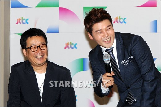 방송인 전현무, 조승욱 PD가 30일 오후 서울 중구 서소문동 중앙일보 M빌딩에서 열린 종합편성채널 JTBC 예능 '히든싱어' 기자간담회에 참석해 웃고 있다.