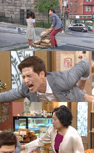 KBS 1TV 일일드라마 '지성이면 감천' 유건이 박세영의 빵집에서 밀가루를 나르다 허리를 다쳤다.