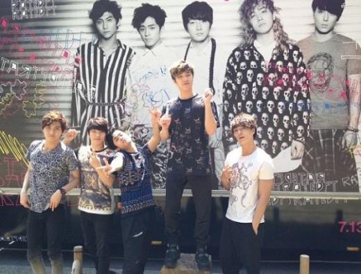 이날 사진 속 FT아일랜드 멤버들은 일명 '에프티카'로 불리는 차량 앞에서 한껏 포즈를 취하고 있다. 이들은 대형트럭에 직접 친필사인을 남기며 기념했다.
