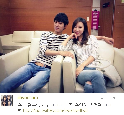 이지혜는 12일 오후 자신의 트위터에 "'우리 결혼했어요' 자꾸 우연히 옷 겹쳐"라는 글과 함께 사진을 게재했다.