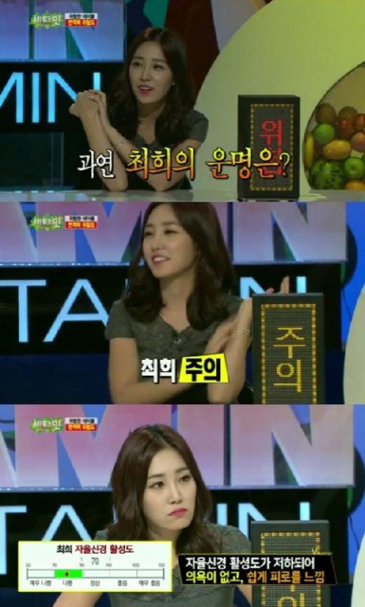 이날 검사 결과 최희는 '주의'라는 다소 걱정스러운 결과를 얻었고 전문의는 "(최희 씨는) 자율신경 활성도가 저하되어 의욕이 없고 쉽게 피로감을 느낀다"며 "평소 햇볕 아래서 30분 정도 가볍게 운동하는 것이 좋다"고 전했다.