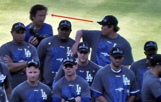 류현진이 다저스 전담 사진기자 존 수후씨를 쳐다봤다. 그러자 류현진의 장난기가 발동하기 시작했다. 유리베의 어깨에 팔도 '쓱' 올리고.
