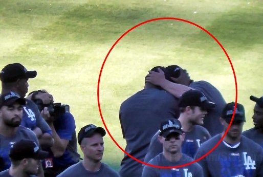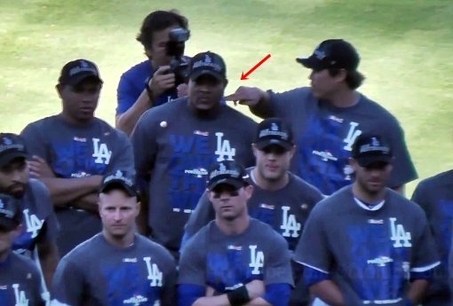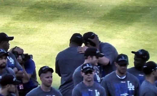 이때 포즈를 취하는가 싶던 유리베는 류현진의 뒤통수를 '퍽' 친다. 류현진도 질 수 없다는 듯이 유리베의 뒤통수를 '퍽!' 치며 맞불을 놓는다.