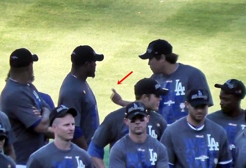 유리베의 반응이 시답지 않자 류현진이 검지를 이용해 유리베의 '뺨'을 찌른다.