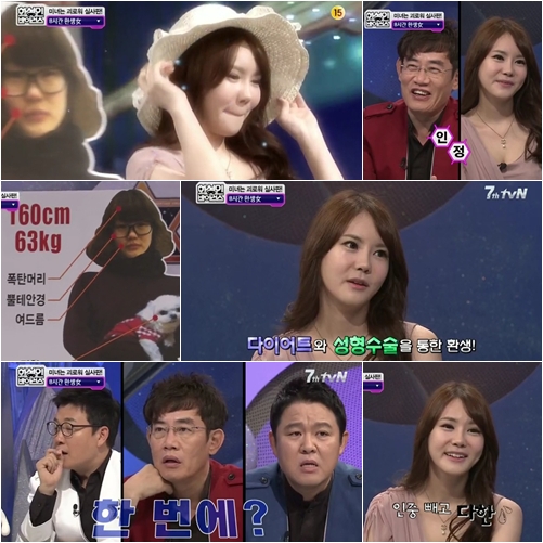 이날 방송에서 8시간 환생녀는 영화 '미녀는 괴로워'의 주인공 김아중처럼 자신감 넘치는 표정과 당당한 워킹으로 스튜디오에 등장했고 3MC들은 그녀의 미모에 감탄을 금치 못했다.