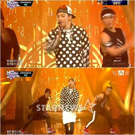 태양은 14일 오후 생방송된 케이블채널 엠넷 '엠카운트다운'에 출연해 신곡 '링가링가(Ringa Linga)'의 무대를 선보였다.