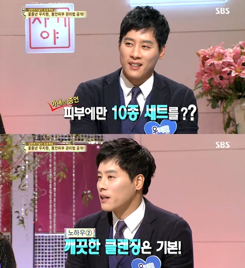 이어 우지원은 "수분 공급도 중요하다"며 "자기 전에 대여섯 종의 화장품을 챙겨 바른다"며 말을 맺었다.