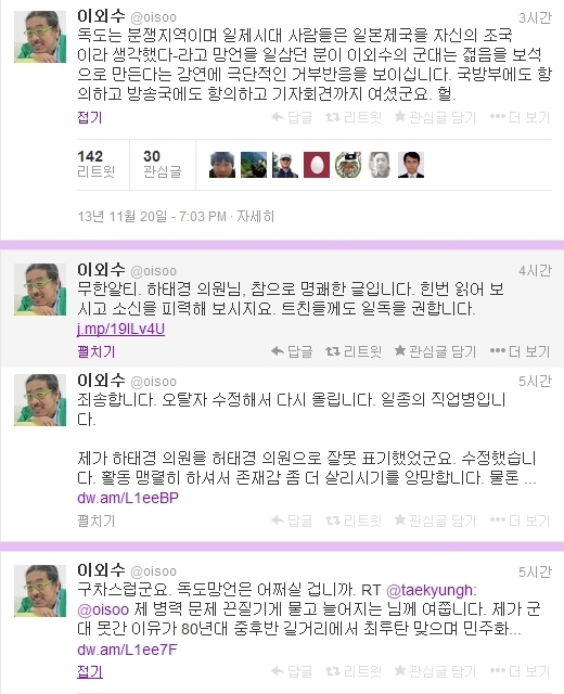 하지만 이내 이외수씨는 "독도는 분쟁지역이며 일제시대 사람들은 일본제국을 자신의 조국이라 생각했다-라고 망언을 일삼던 분이 이외수의 군대는 젊음을 보석으로 만든다는 강연에 극단적인 거부반응을 보이십니다. 국방부에도 항의하고 방송국에도 항의하고 기자회견까지 여셨군요"라고 덧붙여 트위터 설전이 끝날 기미가 보이지 않고 있다.