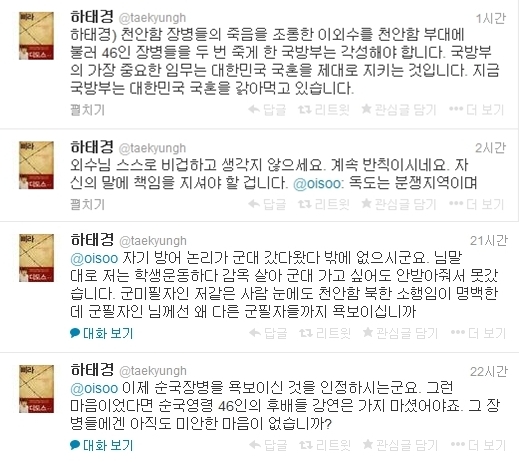 하 의원과 이외수씨는 각자 자신의 트위터를 통해 '천안함 폭침'과 '병역 비리'와 관련해 열띤 설전을 이어나갔다.