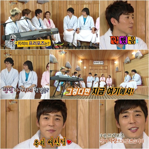 MC들의 성화에 박진영은 얼떨결에 프로포즈를 위한 음악을 건반으로 연주했고 서지석은 "우리 여신님"이라고 영상 프로포즈를 시작했다.
