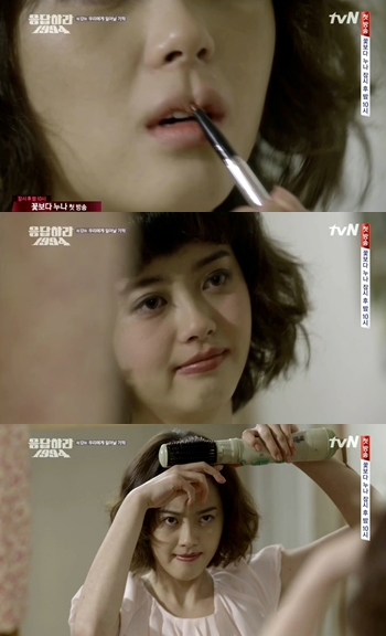 성나정은 립스틱을 두껍게 바르고 눈 화장을 짙게 한 후 머리를 드라이기로 말아 올리며 한껏 멋을 냈다.