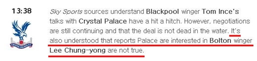 영국 스포츠 전문 매체 스카이스포츠는 31일(이하 한국시간) 밤 "크리스탈 팰리스가 볼턴의 윙어 이청용에게 관심을 갖고 있다는 보도는 사실이 아니다( It's also understood that reports Palace are interested in Bolton winger Lee Chung-yong are not true)"고 밝혔다.