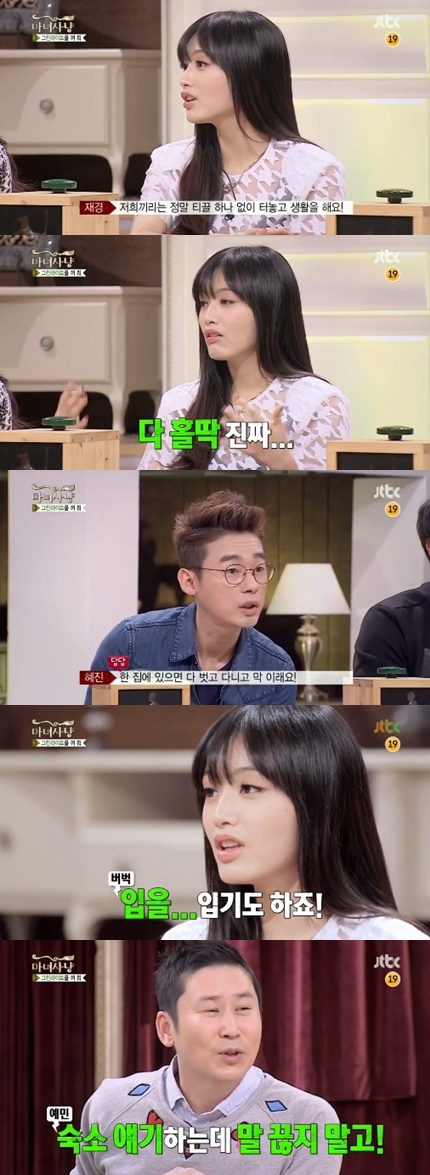 이에 재경은 "그런 건 없다. 저희는 숙소생활을 하기 때문에 티끌 하나 없이 터놓고 지낸다. 아마존 원시 생활하듯 다 홀딱 벗고 다닌다"며 폭탄 발언을 했다.