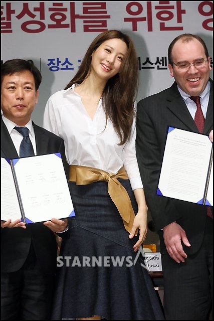 수현은 이날 체결식에서 질의응답 등 발언 시간을 가지지는 않았지만 가장 뜨거운 플래시 세례를 받았다. 밝은 미소로 취재진 앞에 선 수현은 모델 출신다운 완벽한 몸매로 시선을 끌었다.