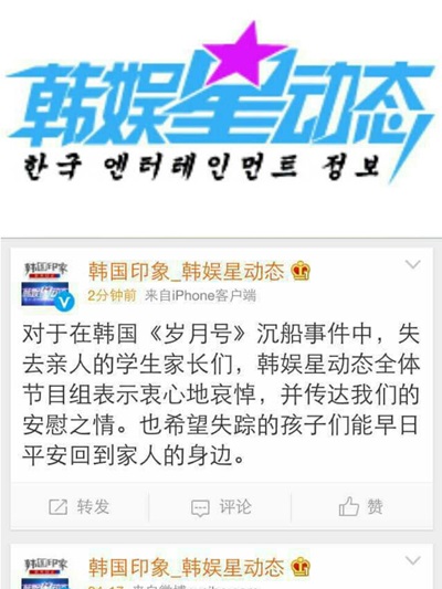 제작진은 20일 중국판 트위터인 웨이보를 통해 "한국 세월호 침몰 사고의 유가족 여러분께 우리 중국 한위싱동타이 제작진은 깊은 애도의 뜻을 표한다"는 글을 게재했다.