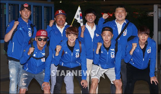 배우 조한선, 가수 김흥국, 스케이트선수 이규혁, 개그맨 강호동, 배우 서지석, 그룹 비스트 윤두준, 그룹 샤이니 민호, 가수 이정(왼쪽 위부터 시계방향)이 27일 오후 인천국제공항 출국장에서 열린 KBS 2TV '우리동네 예체능' 브라질 월드컵 특집 오프닝 촬영을 마치고 출국하기 전 포토타임을 갖고 있다.