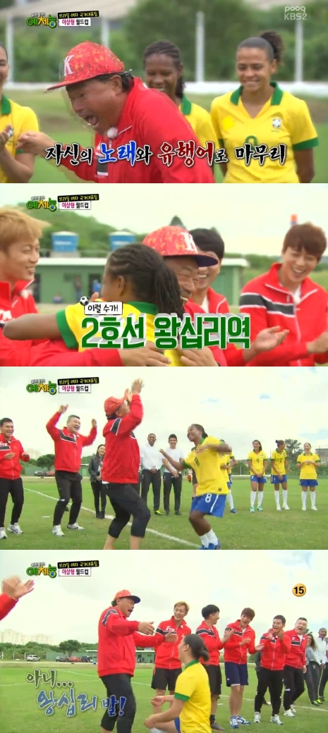 MC 강호동은 브라질 대표팀에 "제일 잘 생기고, 제일 (축구를) 잘 하는 사람"이라고 강조하며 자신의 매력을 어필했다. 강호동을 비롯한 팀원들 역시 자신만의 개인기를 자랑하며 브라질 대표팀의 마음을 얻기 위해 고군분투 했다.