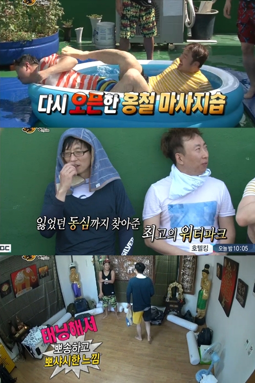 옥상에 어린이용 풀장을 만들어 한창 물놀이를 하다 휴식을 취한 하하는 "선탠 후에 피부가 보송보송"이라며 흐뭇해했다. 다른 멤버들 역시 "진짜 휴가 같다"며 조금씩 세뇌당하는 모습으로 또한 웃음을 안겼다.