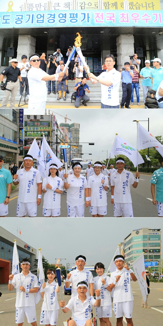 성화봉송 1구간 주주자인 염 시장을 비롯해 박광국 수원시체육회 부회장, 초대 정조대왕인 유근종 수원시 재향군인회장 등이 담당했다. 특히 마지막 15구간은 결혼이주여성인 안명애씨와 유옥선씨가 참가, 아시아 화합을 목표로 하는 이번 대회의 의미를 더했다.