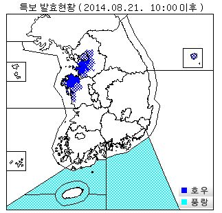 기상청은 21일 오전 9시50분에 "서울을 비롯한 경기도와 충청남도 일부지역, 울릉도.독도에 호우특보가 발효중인 가운데 경기남부지역을 호우경보로 강화한다"고 발표했다.