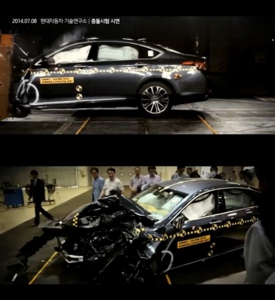 제네시스 충돌실험 영상은 현대차동차가 지난 5월 미국에서 치러진 미국고속도로안전보험협회(IIHS)의 충돌 테스트를 국내에서 재현한 과정을 담고 있다.