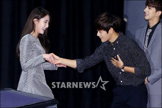 그룹 제국의아이들 김동준(오른쪽)이 19일 오후 서울 영등포구 CGV 여의도에서 열린 MBC 에브리원 시추에이션 예능프로그램 '하숙 24번지' 제작발표회에 참석해 배우 김사은을 에스코트 하고 있다.