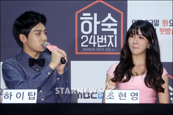 그룹 빅플로 하이탑(왼쪽)이 19일 오후 서울 영등포구 CGV 여의도에서 열린 MBC 에브리원 시추에이션 예능프로그램 '하숙 24번지' 제작발표회에 참석해 발언하고 있다.