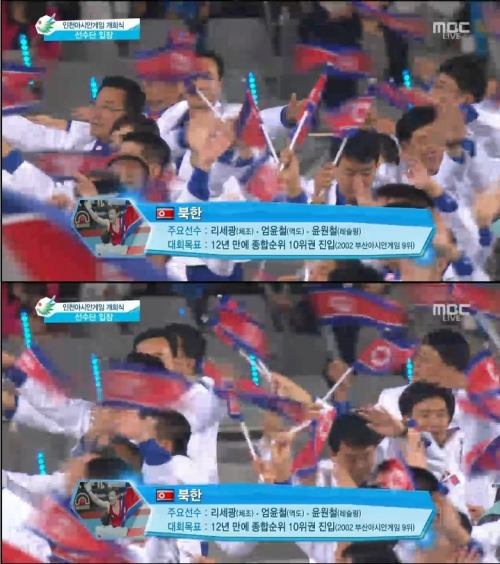 이어 동티모르-라오스-레바논-마카오 차이나-말레이시아-몰디브 순으로 차츰 참가국 선수들과 임원들이 모습을 드러냈다. 이후 29번째 일본에 뒤를 이어 30번째로 북한 선수단이 등장했다. 이번 대회에 북한은 선수 150명, 임원 91명을 파견, 총 241명이 인천을 찾았다.