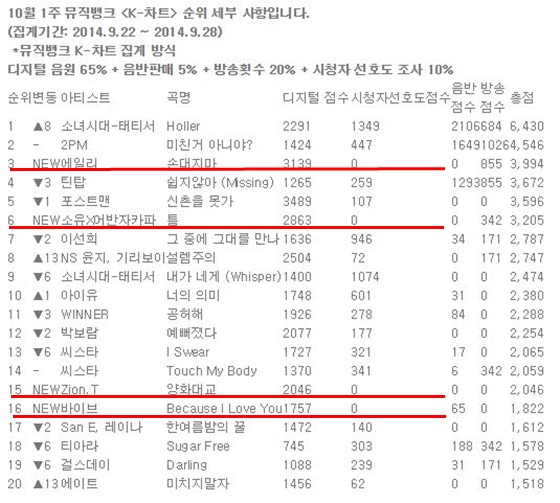 이 주에는 에일리 외 소유X어반자카파의 '틈', 자이언티의 '양화대교', 바이브의 '비커즈 아이 러브 유' 등 K-차트에 새로이 진입한 곡들의 시청자선호도 점수가 모두 '0'이었다. 모두 같은 이유였다.
