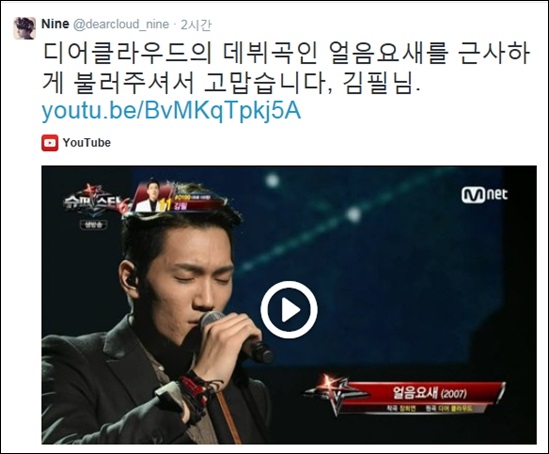 나인은 11일 오후 자신의 트위터에 "디어클라우드의 데뷔곡인 얼음요새를 근사하게 불러주셔서 고맙습니다. 김필님"이라는 글을 올렸다. 이 게시글에는 지난 10일 방송된 '슈퍼스타 K6'에서 '얼음요새'를 부르는 김필의 동영상도 업로드 했다.