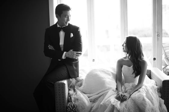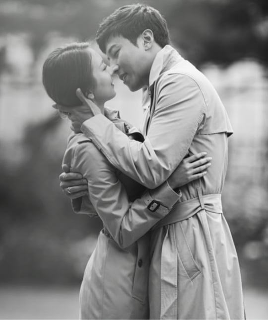 박건형과 예비신부가 각각 수트와 웨딩드레스를 입은 채 사랑스럽게 서로를 바라보는 사진과 영화 '원데이'를 연상시키는 트렌치 코트 투 샷이 눈길을 끈다.