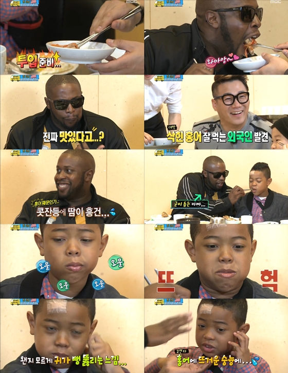 아들 찬도 홍어에 도전했다. 아빠들의 권유에 돼지고기와 홍어를 함께 입에 넣은 찬은 무사히 꿀꺽 음식을 삼켰지만 귀가 뻥 뚫리는 느낌인 듯 눈물을 글썽이며 연신 귀를 만져 또한 지켜보는 이들을 폭소케 했다.