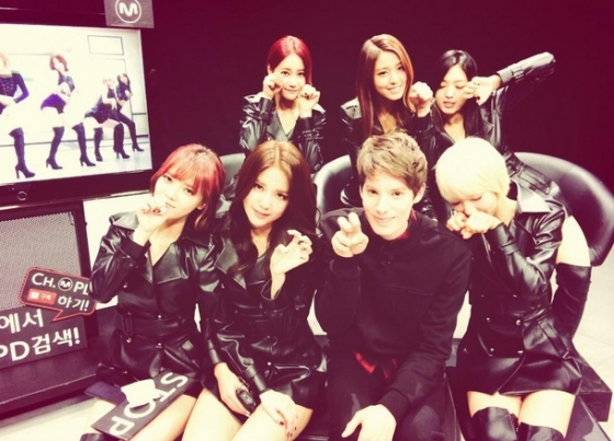 사진은 'MPD’s MV코멘터리'에서 진행자인 파비앙과 AOA가 고양이 포즈를 취하고 있다.