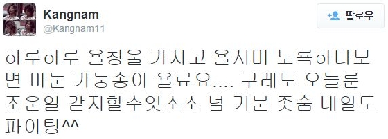 강남은 지난 26일 오후 자신의 트위터를 통해 "하루하루 열정을 가지고 열심히 노력하다 보면 많은 가능성이 열려요. 그래도 오늘은 좋은 일 같이 할 수 있어서 너무 기분 좋음. 내일도 파이팅"이라며 최근 예능 대세로 떠오른 소감과 다짐을 밝혔다.