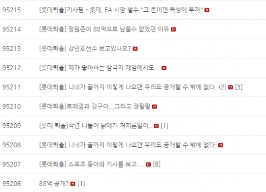 롯데 자이언츠가 장원준(29), 김사율(34), 박기혁(33) 등 내부 FA 3명을 모두 놓치고 말았다. 제시액을 외부에 공개하는 강수까지 뒀지만, 결국 선수들의 마음을 돌리는데 실패했다. 후폭풍 역시 만만치 않다. "실망스럽다"는 팬들의 반응이 줄을 잇고 있다.