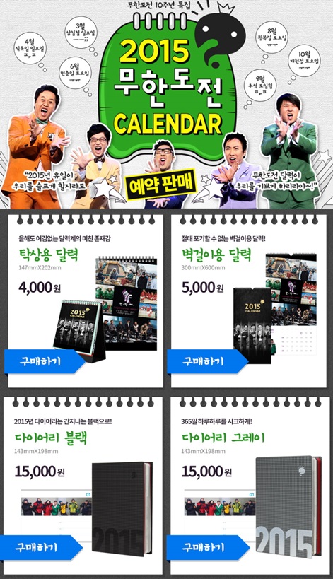 한편 올해도 2015 '무한도전' 달력은 제작비 및 유통비 등 비용을 제외한 모든 수익금을 사회공헌분야에 기부한다. 달력과 관련한 모든 출연자들의 초상권 또한 사회공헌을 위해 기부했다.