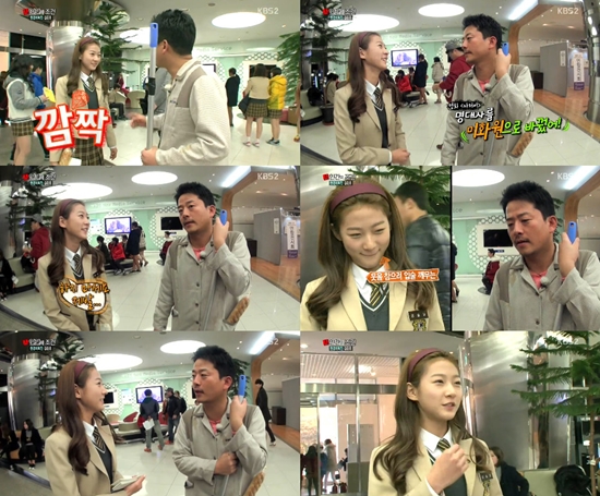 이날 김준호는 KBS 환경미화원으로 KBS 본관 곳곳을 청소하다가 KBS 2TV '하이스쿨-러브온' 촬영 중인 김새론을 만났다.